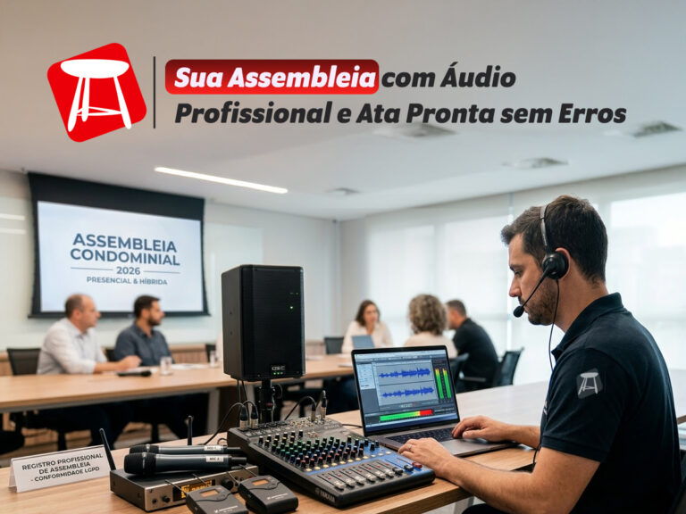 Chega de atas baseadas em memórias falhas ou gravações de celular. Levamos estrutura completa: mesa de som, microfones sem fio e sonorização local. Monitoramento técnico em tempo real para garantir um registro limpo. O arquivo final fica disponível na nuvem por 72h, permitindo que a administradora redija a ata com precisão e velocidade.